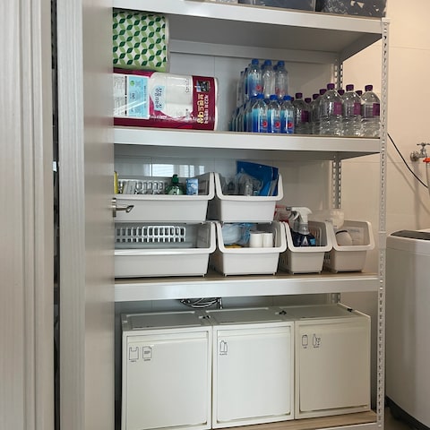 캠핑용품 정리뿐만 아니라 롤휴지나 캐리어, 그리고 필수 육아용품, 물티슈나 철 지난 이불도 보관하기 좋았어요 사실 너무 예쁜 아이보리색이라 더 끌렸던 것 같아요!ㅎㅎ 다용도실 선반 세탁실이나 집 어디에 두어도 잘 어울리는 디자인과 색감이었는데
